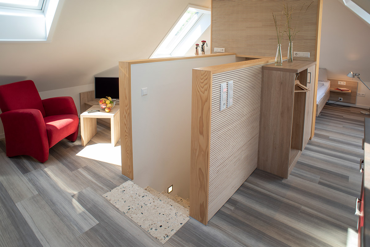 Freuen Sie sich auf eine helle, moderne Ferienwohnung für 2-4 Personen (ca. 45m²) im Dachgeschoss mit herrlichen Ausblicken durch das große Panorama-Dachfenster in's Tal, auf unseren Hausberg, die Moos oder das Lothardenkmal. Mit viel Holz und Liebe zum Detail kommen Schwarzwaldurlauber hier voll und ganz auf ihre Kosten.